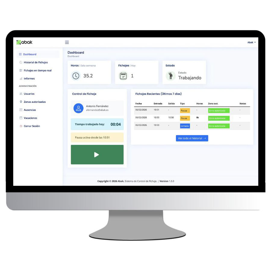 Abak es una plataforma de control horario que permite fichar, gestionar jornadas, controlar ausencias y cumplir la normativa vigente de forma sencilla.